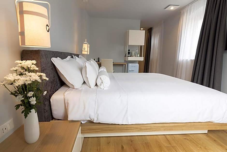 Studio deluxe with balcony is 388 square feet and includes either a queen-size bed 150-154 width or a double bed 131-150 width plus extra beds on demand and ironing set.